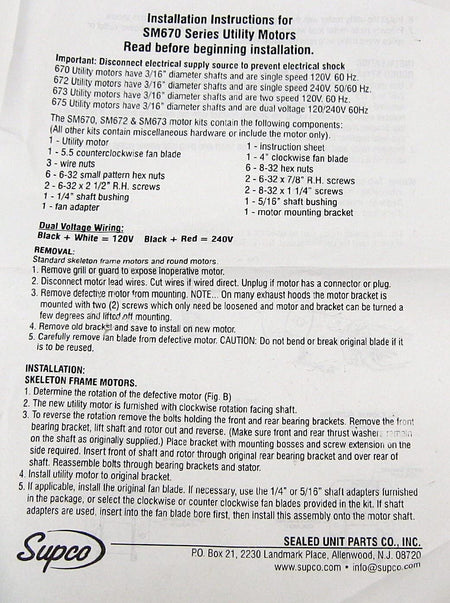 Supco SM675 Utility Motor Kit Single Speed Replaces 90970, 7502, EM675, ERM675